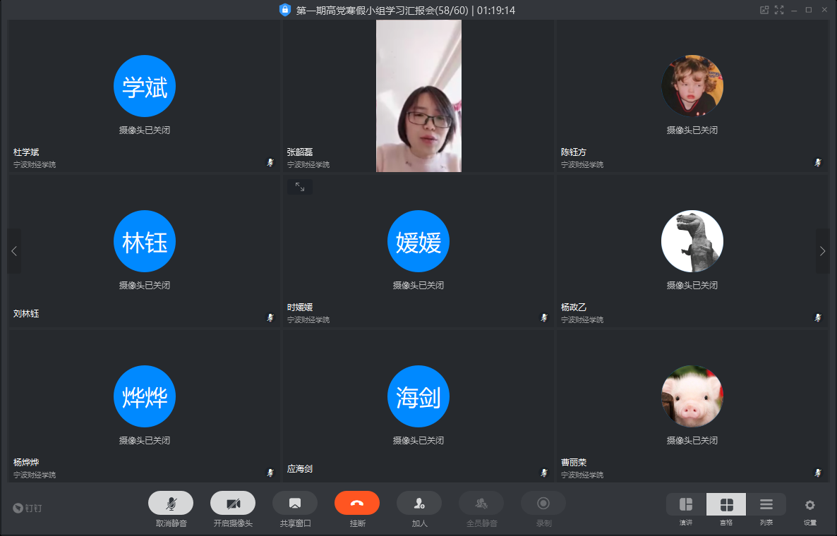 为进一步加强积极分子的思想意识,我院业余党校第一期高级班寒假学习实践汇报会于3月5日下午在钉钉群上举行。院长助理张韶磊出席,52名第一期高党学员和党员之家全体学生干部一同参加。