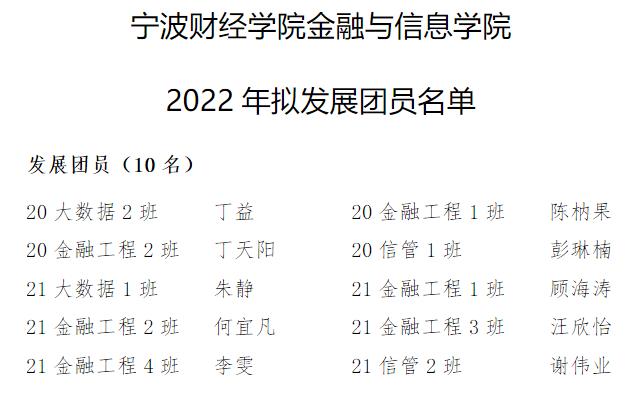 根据团中央《关于加强新形势下发展团员和团员管理工作的意见》(中青发〔2016〕6号)和《关于做好2022年全省发展团员调控工作的通知》 《关于做好2022年全市发展团员调控工作的通知》的工作精神,按照“坚持标准、控制规模、提高质量、发挥作用”的总要求,经过前期资格审查、辅导员推荐、团支部讨论报团委备案,拟确定丁益等10名同学为金融与信息学院2022年团员发展对象,具体名单见附件。