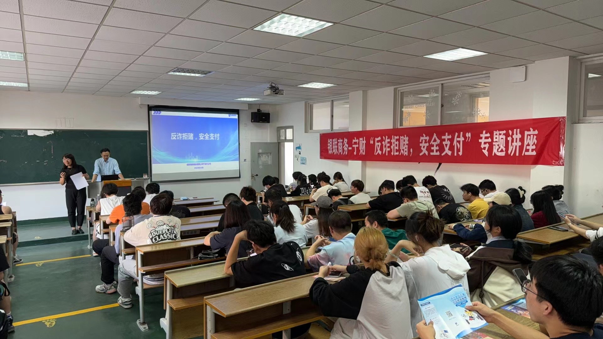 2023年10月26日,我院软件工程系邀请银联商务股份有限公司宁波分公司项目技术部经理钱旭盛、风险合规部主管施海波等一行8人,在南教5-102室为我院学生做了一场“反诈拒赌,安全支付”主题讲座,我院软工专业90多位学生参加此次讲座。