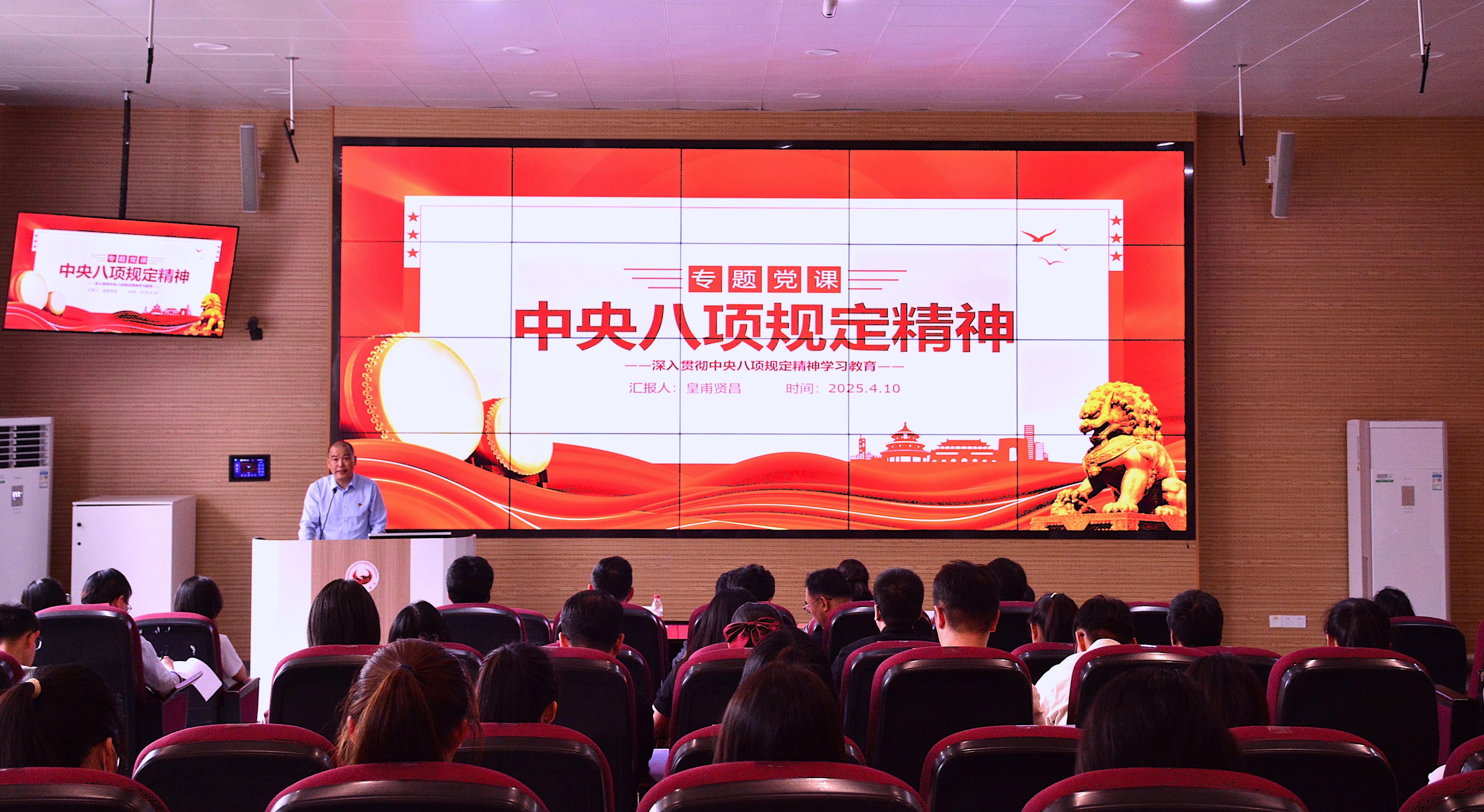 表彰大会后,党委副书记皇甫贤昌上了“深入贯彻中央八项规定精神学习教育”专题党课。他系统阐释了中央八项规定精神的深刻内涵,明确了校院党委对本次学习教育的要求,他强调,作风建设永远在路上,全体党员要持之以恒纠“四风”、树新风。