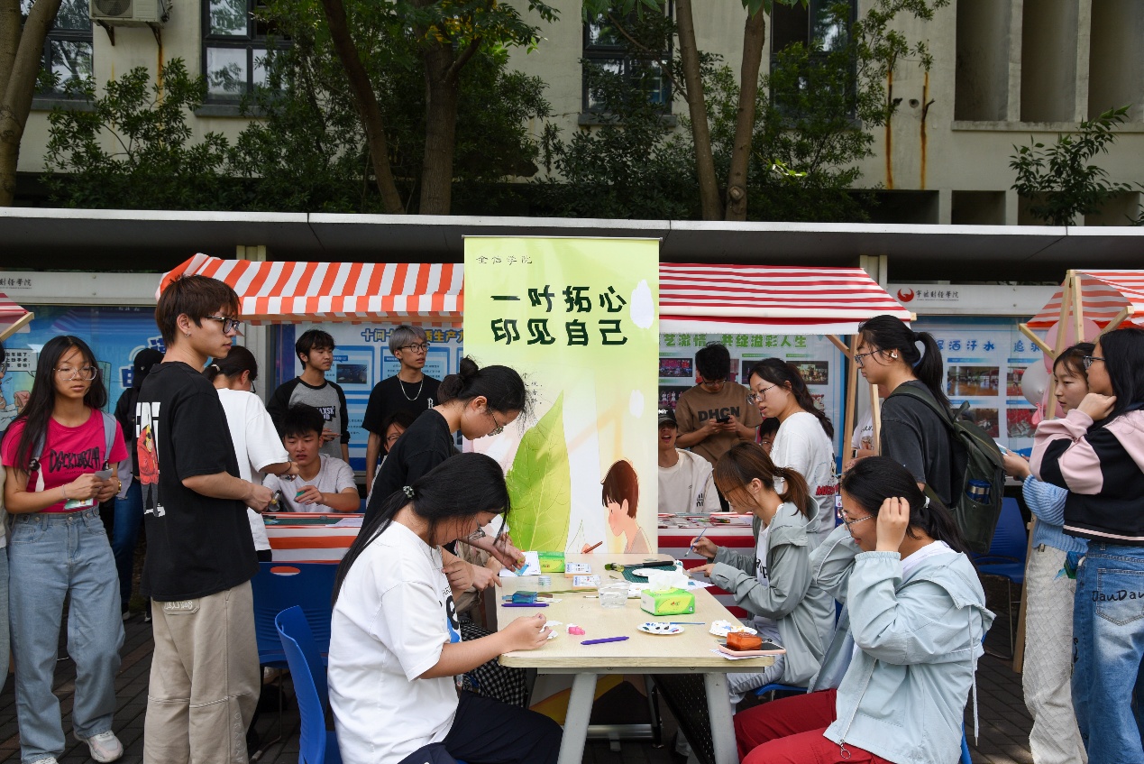 2025年5月22日下午,我校杭州湾校区食堂门前欢声笑语,一场以“为爱赋能,逐梦前行”为主题的“5·25”大学生心理健康文化节活动在此拉开帷幕。我院听心苑精心策划的“一叶拓心,印见自己”叶拓书签制作活动吸引了众多同学参与。