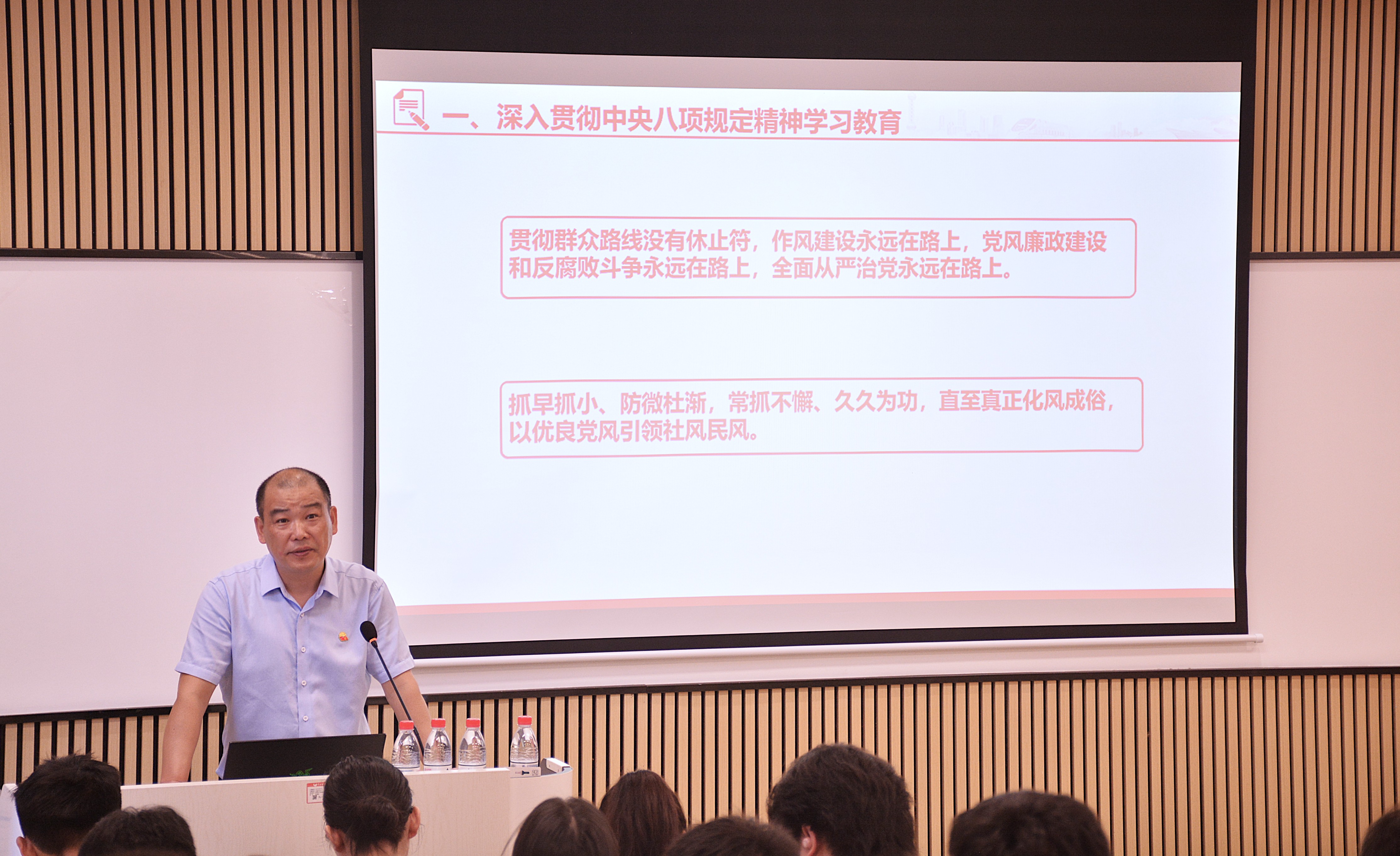 在毕业生党员离校之际,2025年6月15日下午,我院党委于南教5-103室以"践行八项规定精神,走好职场第一步"为主题开展了一场廉洁从业专题党课。院党委副书记皇甫贤昌授课,学院80多位毕业生党员一同参加。