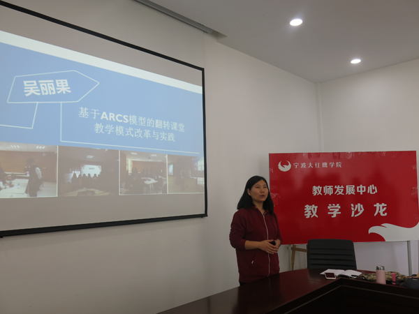 2017年4月20日中午11点30分,教师发展中心第四十七期教学沙龙在9号教学楼412室举行。本次沙龙的主讲嘉宾为我校工商管理学院教师吴丽果,交流主题为“基于ARCS模型的翻转课堂教学模式改革与实践”。来自全校的20余位教师参加了此次沙龙,沙龙由教师发展中心黄莉老师主持。