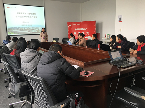 2018年12月19日,教师发展中心第六十七期教学沙龙在9号教学楼4楼412研讨室举行,本次沙龙由人文学院副教授王琦老师主讲,主题为“《高级英语》翻转课堂学习任务导学单设计探索”,来自全校近20位老师参加了本次活动。