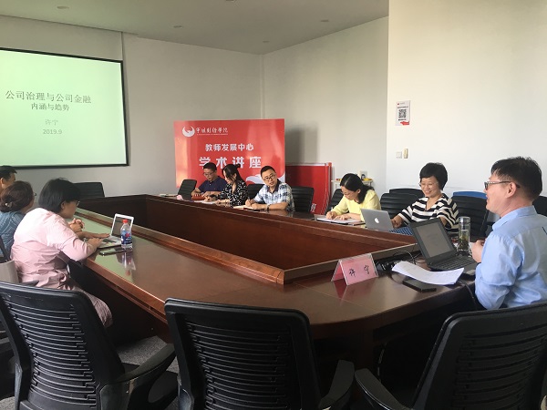 9月24日下午,教师发展中心学术讲座在南教2-412研讨室举行。本次讲座由财富管理学院许宁博士主讲,主题为《公司治理及其研究趋势》,来自财富学院的相关老师参加了讲座。讲座由教师发展中心主任王志军主持。