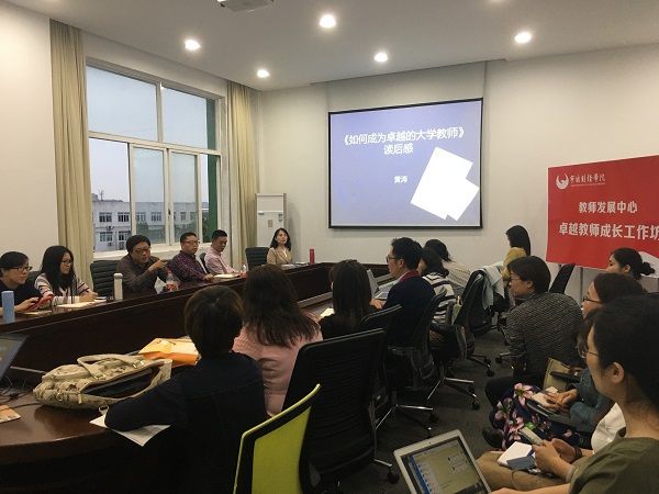 工作坊学员劳蕾蕾、黎科、黄涛、龚俊、王显金等五位老师就《如何成为卓越的大学教师》《大学使命与文化创新:高校服务文化创意产业研究》《管理学问卷研究方法》等著作汇报了个人读书心得。各位老师首先对所读著作进行了简单介绍,着重分享了自己的读后感悟,在谈到《如何成为卓越的大学教师》读后感时产生了共鸣,认为该书透过一个个生动的故事,为我们描绘了精彩教学的典范,例举了学生展现创意和发掘自己潜能的实例,揭示了卓越教师对学生产生持久积极影响的秘密,并由此引发其他在座学员对逐渐向成为一名卓越大学教师这个目标靠拢的热烈讨论。在座教师纷纷表示读后受益匪浅,既感到压力,又受到启发,作为高校教师一定要立足学生、潜心教学、积极反思、回归本真。