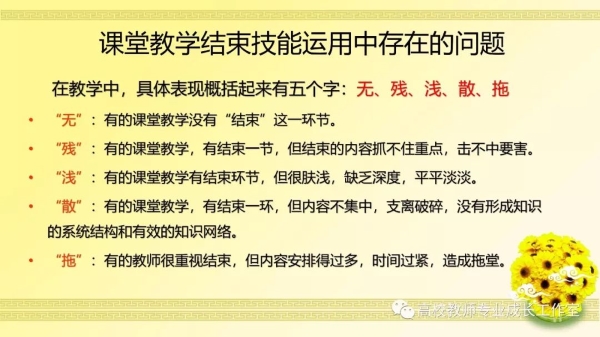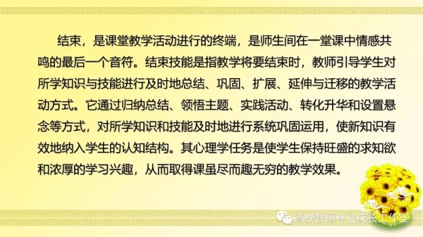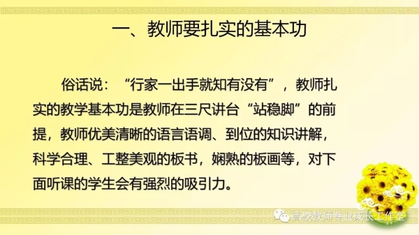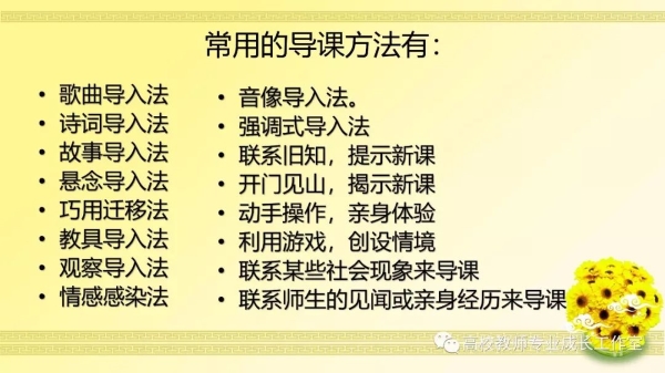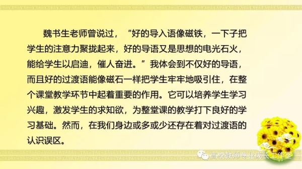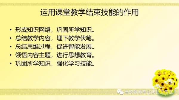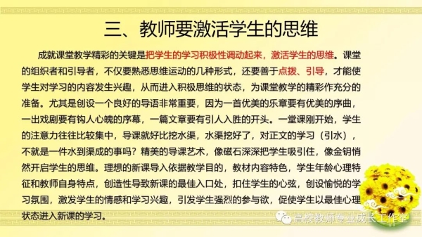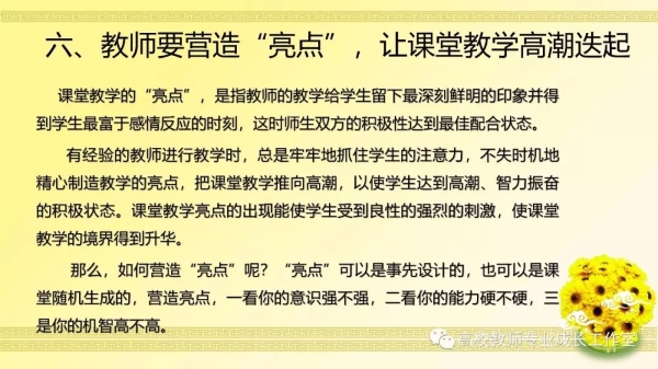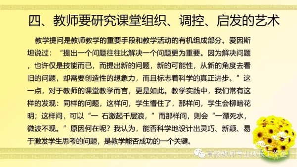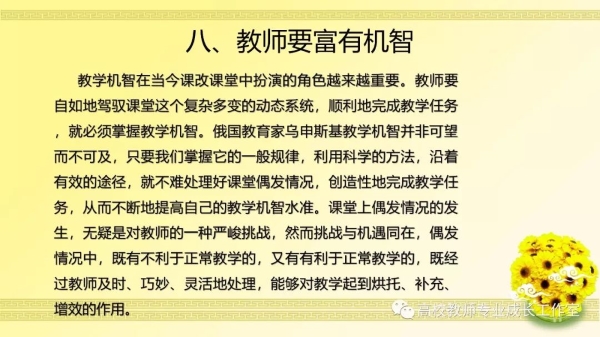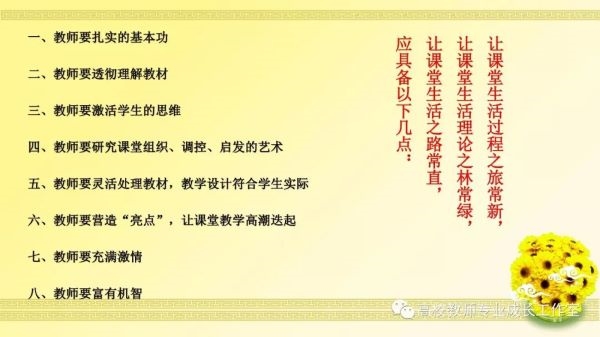 (一)课堂调控能力。上课是个动态的过程,课堂上许多生成性东西不可预见。面对课前没有估计到的这些教学问题,教师要根据课堂实际情况及时调整课堂教学,改变既定教学环节,引导学生将注意力集中并保持在教学活动上。要学会循循善诱,要把一个大问题,难问题,破解成几个学生易于接受的小问题,环环相扣的问题,最后学生水到渠成的得到答案,引导学生提出问题,发现问题,引导学生思考,开发思维,拓展训练,引导学生到达目标。让课堂“活而不乱”,既有温度,又有深度。学法指导使学生能够掌握科学的学习方法,并灵活运用于学习之中,逐步形成较强的学习能力。学生在学习过程中才可能学会学习。激发起学习积极性后,要保护这种积极性,让学生始终处于亢奋。学生的兴奋点在上课后的15分钟,那么如何调动保护,就得需要技巧,如加强纪律要求,表扬与批评等。教育的最大技巧就是“爱”,当你拥有一颗爱心的时候,你也就拥有了一切教育技巧,教育艺术。如导入的技巧,提问的技巧,评价的技巧,都源于爱。(二)信息反馈能力,课堂教学反馈是师生之间、生生之间多向信息交流的过程。需要教师及时捕捉来自于学生的各种信息,通过分析,转化为有效的教学资源,从而引发新的学习。