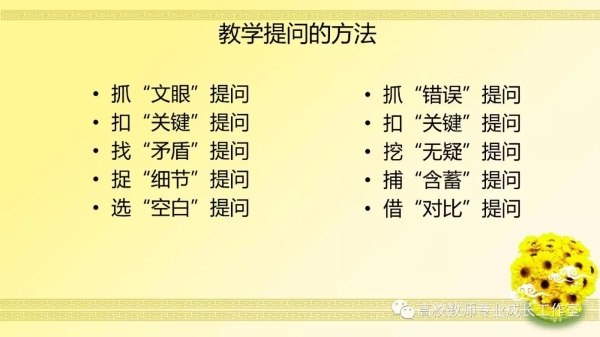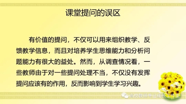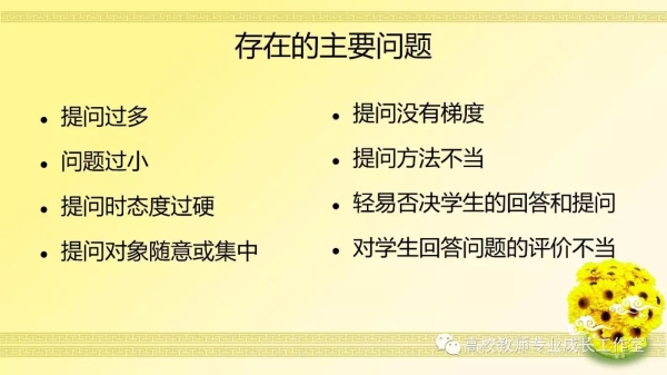 课堂提问,既是一门科学,更是一门艺术;好的提问,能激发学生探究学习问题的兴趣,激活学生灵动的思维,“问”出学生的激情,“问”出学生的创造。设计的提问要有为学生构建真实的问题情境。要为学生提供适当的思考空间。课堂提问要难易适中,教师要把握好课堂提问的“度”应符合学生实际的认知水平和想象能力。设计的提问要要紧扣学生的学习内容。针对学生感兴趣的问题,进行课堂提问。在新课导入时可以精心设计一两个问题,目的不在于要学生立即回答,而在于引起学生学习新知识的兴趣,充分调动学生学习新知识的积极性。有效“提问”意味着教师所提出的问题能够引起学生的回应或回答,且这种回应或回答让学生更积极地参与学习过程。使问题保持一定的难度。记忆型的问题难度最低,对学生要求不高,只要能够准确回忆起以前学过的知识,并正确作答即可。理解型问题需要学生对所记忆的知识进行一定的理解和加工。应用型问题“鼓励”把新学的材料用于新的不同的环境中。有效提问的语言应力求做到即准确、简洁、清晰,问题必须有学习价值,有启发性,引发思考与探究。提问必须考虑趣味性、挑战性,引人入胜、深入浅出,启发学生学习兴趣。提问能引起大多数学生的思维共鸣,使课堂气愤一下子活跃起来。好的提问能激发不同角度的思维,因而也有各不相同的回答,涉及的知识广而且综合性强。对学生的回答哪怕是错误的也应该尊重、鼓励,积极鼓励有利于维护学生自尊心,有利于学生进一步思考、去探究,有利于不失去对教师与课内容的兴趣,有利于形成好的学风。有效提问的注意事项:发问:准确把握发问的时机,注意问题的层次性,一个问题尚未作出明确的结论之前,不要再提出一个新问题,以免干扰学生。向全体学生发问,然后指名问答,抽答面要广,努力使全班学生回答问题的次数大概相同。提问之后要停一会儿,让学生有时间思考。教师为不能回答问题或回答错误的学生提供线索。打开思路,启发他们正确回答问题。当学生的回答正确而不充分时,教师要给学生补充另外的信息,以便学生能得出完整的答案或者回答正确后,引出一个更深层次的问题。