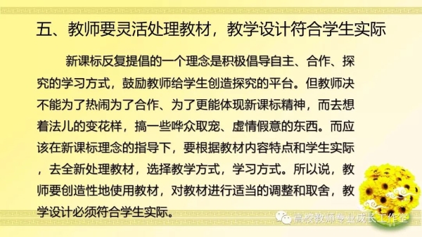 2.开放性,有效教学设计立足于课堂是一个开放的生态系统,从单一的书本知识向学生的生活、生产和社会等方面拓展,教学过程注重师生的交流互动与心灵对话,让学生多一些感悟、体验的机会,多一份参与的激情和动力。