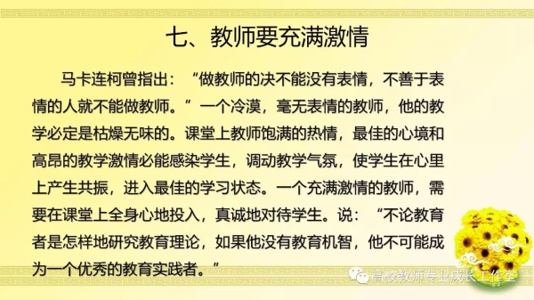 教学艺求是对教学的艺术掌握,即从艺术的角度对教学的艺术属性的理解及据此发展起来的教学力式、方法、手段、形式等。教学艺术首先要从教师的讲台形象谈起,教师的讲台形象尤如演员的舞台形象一样重要,教师讲台形象自我塑造得如何,如衣着打扮,表情态度、身姿动作,口语、板书等,都直接影响到课堂教学效果。第二,教师要注重讲述艺术。讲述要注重两性,即科学性和艺术性。科学性要做到客观、准确、完整;艺术性强调以情感人,以语动人,以形诱人,紧扣学生心弦,以达到师生与作者和事物之间感情的共鸣与沟通。第三,要注重无声语言的艺术。无声语言是一种艺术,并不新鲜。有声语言也有言不尽情,辞不达意的时候,此时无声语言就能表达只可意会,不可言传,言尽而意丰的作用。古人也有言:此时无声胜有声。无声语言主要通过面部表情和眼神来传递。面部表情是阳光、春风,可催开心灵的蓓蕾;是军号,可给人以力量:是天使,可唤起学生对美的追求自然、大方、温和、善良、宽容、大度是教师面部表情的要求。眼神,这个心灵窗户,把能表达言所不易表达的复杂而微妙的信息情感。环视、点视、虚视、斜视、久视都有其特殊含意。环视有“一言未发先有情”的作用,点视有制止、期待、鼓励之功效,虚视有“视而不见”之味道,斜视有“轻蔑”、久视有厌恶之含意。这些都是无声语言的魅力。第四,要讲究体态艺术。体态也是一种教学艺术。体态主要包括头语、身资、手势。头语要求亲切明快,手势要求准确协调,身姿要求端庄灵活。恰当的体态会给学生留下深刻的印象,取得极佳的教学效果。最后是板书艺术。板书是教学的书面语言,也是课堂教学的重要资源,是提高教学效率,完成教学任务的有效手段。有艺术性的板书能唤起学生注意,启迪学生思维,激发学生的灵感,提高教学效果。板书可采用逻辑要点式,关键词语式,纲要信息式、表格式等形式,来强化讲授效果。当然,板书的合理布局、示范性、书写规范优美,更能锦上添花。