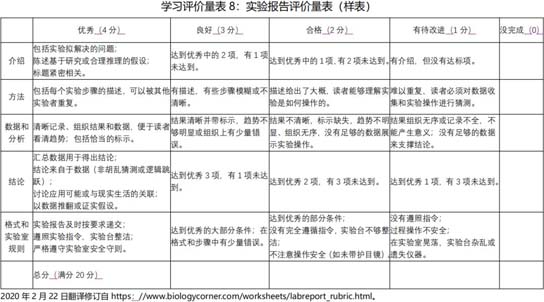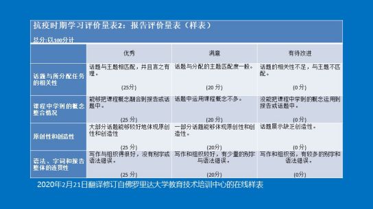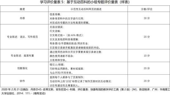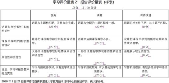 现在把我们的注意力聚集到学习评价环节上来。学习评价是对教学目标达成的衡量,也是检验教学有效性的工具。课后作业、标准化考试是我们目前常用的手段,而评价量表则相对而言用得较少。有学者将评价量表视为继黑板发明之后最方便的教具之一(Stevens & Levi,2004)。那么,所谓的评价量表又是怎样的一个教具呢? 让我们一起认识一下学习评价量表吧! 一、学习评价量表是什么? 学习评价量表(Learning Rubrics),是一项作业或任务评分工具,它清晰表达了教师对学生学习表现的期望。它更是一种是学习促进工具,是一种强大的教与学的反馈和交流工具。它一般由两个维度构成,即学习成果要素(Learning Outcome Components)和表现水平(Performance Levels),并通过描述性语言形成一个二维矩阵。它既可用于课堂,也可用于课后,可以贯穿整个教与学的全过程。学习评价量表能够促进“学生中心、成果导向、持续改进“的教育教学理念的实施。   二、学习评价量表有什么用? 学习评价量表在改进学生的学、教师的教、师生互动关系以及公平公正的育人氛围等方面起着良好的塑造、提升和促进作用。 1.明晰学生对学习成果的预期。“有目标,才有箭之所指“。清晰的学习成果预期,是对学生学习的有效牵引,是对学生学习自始至终的隐性指导。通过学习量表的设计,可将学习成果有效地分解到学生作业或任务中去。  2.加强学生对学习成果的巩固。评价量表除了形成分数、等级以外,还给学生以规范、及时和有意义的反馈。学生互评则更能为学生创造互学互鉴的机会。学生可以清楚地知道自身弱项所在,可以通过更大努力进行弥补提升。 3.增进教师对学生学习的了解。学习评价量表可以帮助教师清楚地了解学生的优势和劣势。通过统计各要素达到可接受水平的学生数量,可以确定哪些要素需要更多的教学时间和学生的努力。这对改进教师教和学生学的方法、策略都有着重要意义。同时能够留下教学过程和教学有效的佐证依据。 4.提高学生对评价公正的认知。利用量表评价学生学习,有利于保持评价标准的客观性和群体内学习个体的一致性,即能够做到“一把尺子量到底”。不会受到使用者的评分时间、情绪以及以往经验的干扰。即使是不同评价者,也不会产生大的偏差。同时,也有利于在学习成果、教学活动以及学习评价关联和一致。这样能够让人感受评价的客观、聚合和公正。 让我们一起动手来设计学习计量表吧! 三、怎样设计学习量表? 学习量表设计并非高不可攀,只要您掌握好以下几点,您编制的量表质量一定是棒棒的。 1.量表设计的取向是要从“学习的评价”(Assessment of Learning)转向“为了学习的评价”(Assessment for Learning),评出ABCD、甲乙丙丁、子丑寅卯不是最终目的,促进和改善学生学习、最终达成学习成果才是最终目的。 2.量表设计时,学习成果(Learning Outcomes)构成项不宜太多,要紧紧抓住作业的要件,忽略次要因素,一般以5-8项为宜,并合理分配各要件的权重。量表设计除了知识(Knowledge)、技能(Skill)取向外,还要充分关注情感(Emotion)和价值(Value)取向,积极整合思政要素。 3.运用表现水平来记录学习成果的达成度(Achievement Levels),并以此为依据改进教与学,不要过多地聚集在错误上。可以让学生参与评价量表的设计与反馈。 4.语言表述尽量做到客观(Objective)、具体(Specific)、积极(Positive)并且富有建设性(Constructive),尽量避免使用模糊、消极的语言表述。优秀(Excellent)、良好(Good)、可接受(Acceptable)和有待改进(Need improvement)是一组不错的组合。   让我们一起试着用用学习量表吧! 四、如何使用学习评价量表? 在这疫情防控的特殊时期,我们实施的都是线上教学。如何转危为机,合理使用量表?我们可以从以下几个方面考量。 1.学习评价量表的使用范围广泛,可以运用于一系列的作业和任务评价。包括论文(Paper)、短文(Essay)、项目(Projects)、口头报告(Oral Presentations)、小组作业(Group Projects)、艺术表演(Artistic Performance)、讨论(Discussion)、实验(报告)(Lab/Report))等。 2.学习评价量表既可以用于教师评价学生的作业,也可用于学生对自己的作业进行自评或者同学之间进行互评。在学生自评和互评的基础上,评价者不必要写冗长的评语,评价者的工作量就减轻了,同学互评更能取长补短。 3.学习评价量表普遍适用于各个层次的学生,越到高阶学习(High-level Learning)的层次(本科生、研究生)其运用的机会越多,成效也越显著。 4.特殊时期,是学习量表的使用“黄金期“,我们需要通过整体设计,把学习量表作为一个重要教学工具,结合教学大纲的”在线化“整体改造,将学习量表更多地使用于主动学习(Active Learning)、合作学习(Cooperative Learning)、探究学习(Research-based Learning)、问题解决学习(Problem Solving Learning)的评价当中。 我们通过译制、改制、编制等方式收集整理了部分能应用于在线教学的评价量表,以飨读者,希望能助益在线课程的“改起来、强起来”。大家如有兴趣,可以对参考文献(顺便为陈定刚老师,丁研、高亚萍老师译的两本译著打一下广告)的内容进行深入学习和研究,并与我们一起探讨。相关样表请点击以下链接:http://wdxy.zjnu.edu.cn/2020/0221/c11607a316050/page.htm(部分量表出自陈定刚老师的译著)。