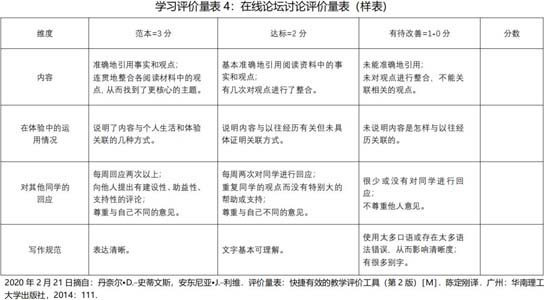 参考文献:1.丹奈尔•D.史蒂文斯,安东尼亚•J.利维.评价量表:快捷有效的教学评价工具(第2版)[M].陈定刚译.广州:华南理工大学出版社,2014.2.D.兰迪加里森,诺曼D.沃恩.高校教学中的混合式学习:框架、原则和指导[M].丁妍,高亚萍译.上海:复旦大学出版社,2019年.3.佛罗里达大学教育技术和培训中心在线学习量表栏目,见http://citt.ufl.edu/online-teaching-resources/assessments/rubrics-in-online-learning/.4.卡内基梅隆大学艾伯利教学卓越和教育创新中心(Eberly Center,Teaching Excellence&Educational Innovation)评分的表现量表栏目,见https://wwwNaNu.edu/teaching/designteach/teach/rubrics.html.5.托罗学院高等在线教育栏目,在线课程作业量表,见http://citt.ufl.edu/online-teaching-resources/assessments/rubrics-in-online-learning/.