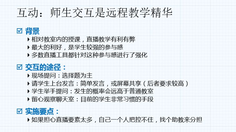 (2)线上直播课不等于传统课堂的直接复制,通常需要重新设计课程。首先要确保所有授课需要的教学材料都在手边;其次要预先练习上课可能要提问的问题;而且要确定是否要求学生随堂抢答,是否要用教学平台实时发放选择题,等等。