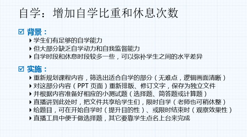 (1)明确在线授课类型,重组课程大纲,重新打包知识点。基础知识点优先,深度知识点除不能移动者,最好后移待面授时开展。