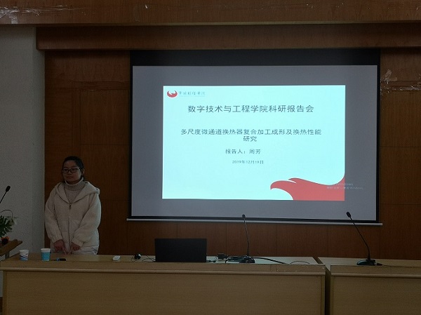 2019年12月19日下午14:00,数字技术与工程学院有幸邀请到厦门大学周芳博士(博士后)作《多尺度微通道换热器复合加工成形及换热性能研究》报告。会议由张育斌老师主持,报告会地址设在南区办公楼2楼报告厅,参会人员为学院全体教师。