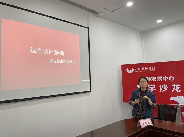 4月27日下午,教师发展中心在南教2-412研讨室举行第九十期教学沙龙,本次沙龙为课程标准研讨专题活动,由数字技术与工程学院王景丽老师主讲,主题为“《程序设计基础》课程标准执行情况”,来自全校二十余名教师参加。沙龙由教师发展中心主任王志军主持。