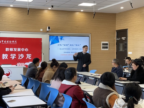 11月11日中午,教师发展中心在南教2-112创新观摩空间举行第九十四期教学沙龙,本次沙龙由财富管理学院陈宏老师主讲,主题为“打造‘金课’塑造‘精生’,线上线下有机融合,创新课程育人模式——以《财务管理》教学为例”,来自全校共50余位教师参加,沙龙由教师发展中心王志军主持。