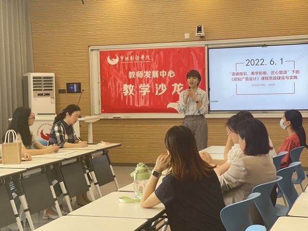 6月1日中午,学校第35期课程思政系列教学沙龙在南教2-112举行。来自艺术设计学院的俞奕秋为大家开展主题为“‘道德指引、美学影响、匠心塑造’下的《招贴广告设计》课程思政建设与实施”的交流分享,线上线下近50名教师踊跃参加。
