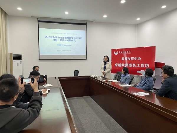 交流会由徐萍、陈宏两位老师分别就《浙江省数字经济加速赋能实体经济的机制、路径与对策研究》《专业教师指导学生学科竞赛的几点思考》两个主题做了汇报。首先,徐萍老师结合其省软科学课题,从课题申报、所研究的内容、完成成果及结题等方面进行了详细的体会分享。陈宏老师则结合财会信息化、经管案例、金融创新等省级大赛,从团队组建、主题确定、报告撰写和对策建议等方面进行了详细分享。