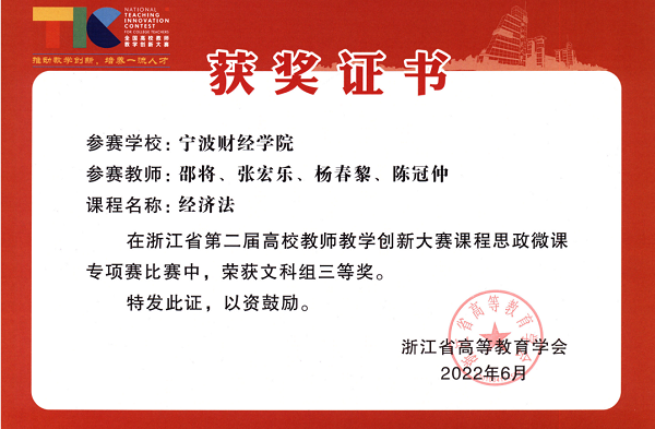 主持建设《经济法》课程,先后获立2020年度浙江省“一流课程”、2022年度浙江省高等学校“课程思政示范课程”。