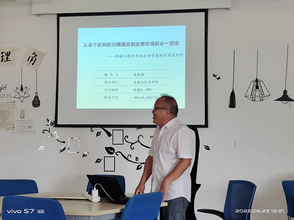 6月23日中午,教师发展中心第146期教学沙龙在南教6-402举行。本次沙龙由金融与信息学院朱相诚主讲,主题为“从行业机构的分隔建设到全部市场的合一塑造——金融工程专业校企合作基地的集聚创新”。来自全校30余位老师参加,此次沙龙由金融与信息学院周春良主持。