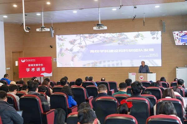 讲座中,陈武元教授结合个人经历和厦门大学的经验,深入探讨了学科建设与科研团队建设的重要性。他指出,学科建设涵盖学科方向、学科基地、科学研究、人才培养、学科队伍及制度建设等六方面,需统筹教学与科研,将科学研究与人才培养紧密结合。同时,要兼顾硬实力与软实力,做好内部资源与外部资源的合理配置。之后,他从科研视角切入,强调科研团队及教师个人的知识生产能力的重要性。他曾推动 “知名学者+科研团队”的科研组织模式,主张组织跨学科研究团队,明确分配原则,构建公平公正的劳动共享机制,以实现更优的学术协作与创新突破。 讲座后,陈武元教授调研了我校教师发展工作情况,肯定了教师发展中心在学科建设中的关键作用,并围绕教师发展模式等前沿问题提出了建设性意见与建议,为我校师资队伍建设提供了新的思路与方向。 (撰稿:教师发展中心 何佳文;摄影:宣传部 吴垒均;审核:教师发展中心 王志军)