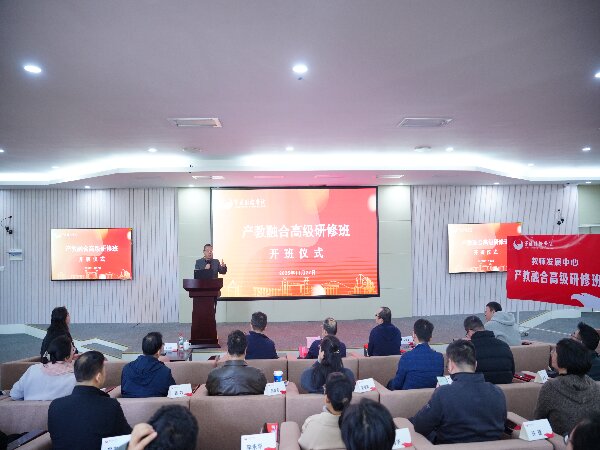 在开班仪式上,李国平代表学校对莅临现场的胡赤弟教授表示热烈欢迎,并向全体学员表示祝贺。他认为,当前,新一轮产业变革加速演进,高等教育与产业发展的深度融合已成为推动经济高质量发展的关键引擎。产教融合不仅是技术迭代的产物,更是培养复合型、创新型人才的战略选择。它要求我们突破学科壁垒,让教育真正扎根产业土壤,实现“教育链—人才链—产业链—创新链”的有机衔接。对此,他对班级学员提出三点期望:一是做产教融合的“学习者”;二是做改革创新的“探索者”;三是做成果落地的“践行者”,并愿各位学员学有所获、研有所成。