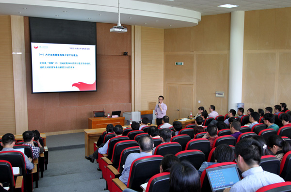 5月8日下午,我校“教育思想学习研讨”系列活动第五场专题报告会在阶梯教室202举行,校长助理沈云慈做《学校文化理念系统:背景、内涵与实践》专题报告。全体中层及以上干部,各二级学院学科负责人、专业带头人、教研室负责人,管理骨干培训班全体学员及有关职能部门人员等到场聆听了报告。报告会由校长助理高振强主持。 报告中,校长助理沈云慈从背景、内涵与实践三方面全面深入地解读了学校文化理念系统。他从大学文化建设的重要性谈起,通过对我校文化理念系统建设过程的回顾与梳理,介绍了我校文化理念系统的构建背景。他说,大学是文化的载体,文化是大学的灵魂。大学的建设与发展需要大学文化为其注入坚强的生命底蕴,并发挥出强有力的价值导向、群体凝聚、情操陶冶和社会辐射等一系列功能。目前,我校正处在转型发展的关键时期,亟需用文化来引领和推动,大学文化建设显得尤为重要。在学校十余年的创办、建设、发展过程中,蕴含着一种信念、一种力量、一种精神,由此也孕育了我校的大学文化,学校文化理念系统正是对这一文化的总结和提炼。  基于此,校长助理沈云慈详细解读了以浙东文化精髓思想和学校历史积淀的“鹰的精神”为脉络的学校文化理念系统主要内涵。他说,在文化理念系统构建脉络上,学校坚持历史传承与发展创新相结合,融合了学校创业发展阶段的精神品质、未来发展的办学理念与定位、地域传统文化等三方面因素,既接浙东文化“地气”,又充分体现了学校价值取向、大学品格、办学理念、办学特色、育人要求与未来追求。在概括阐述了浙东文化精髓思想及“鹰的精神”主要内容的基础上,他重点诠释了涵盖精神理念层、理想使命层、行为准则层三大层面十项条目的文化理念系统具体内容,包括“百折不挠、超越自我、不断追求崇高目标”的学校精神,“致良知、育实才、立善业”的办学理念及“知行合一、随才成就”的教育理念;“成为中小企业发展的首选大学”的办学理想、“探索中国民办高校发展的成功道路”办学使命以及“领先的、有改革创新示范价值、特色鲜明的民办大学”发展目标;“自信、专注”的校训,“崇实、尚新、融合”的校风,“乐学、笃行、致用”的学风以及“正德、精业、厚生”的教风。   如何在实践上落实学校文化理念系统各项内容?校长助理沈云慈提出,重点要在办学定位、人才培养、干部和教师要求、学风建设、制度建设、校园环境形象建设及校园文化活动等方面体现学校文化理念的思想内涵,并在教书育人和管理服务等实践中加以贯彻和落实。