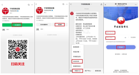 第2步:关注 “宁财院微后勤”公众号并选择“自动洗车”(或扫描洗车机上的二维码)。付费完成后机器自动启动,首次使用需使用学校统一身份认证账号完成认证。