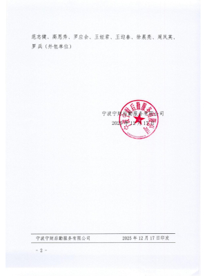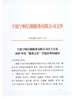 近日,在宁波宁财服务有限公司2025年度“服务之星”评选活动中,蔡有峰、陈亚儿、陈焕军、戚施恩、李艳菲、梁志金、徐膨伟、葛云福、郎月芬、吴旖旎、张静苏、周杰、韩平平、胡儿君、胡前平、芦娟、黄仁丰、晏巍、陈宏、范志健、高恩秀、罗应会、王娅君、王迎春、徐晨亮、周凤英、罗兵荣获2025年度“服务之星”荣誉称号。