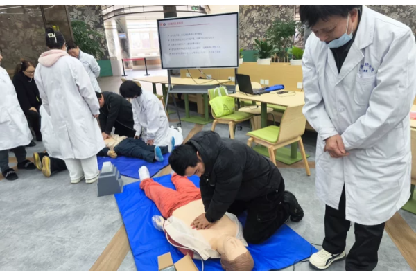 在实操环节,参训人员以小组为单位,借助教学模拟人教具,在医护人员的专业指导下,依次开展心肺复苏按压、人工呼吸等实操训练。现场学习氛围浓厚热烈,参训人员互动踊跃,实操动作严谨规范,充分展现出认真专注的学习态度。