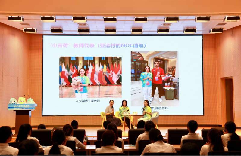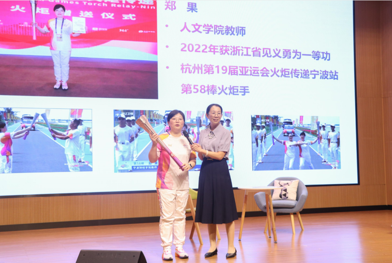 这堂思政课邀请到浙江省见义勇为一等功获得者、杭州第19届亚运会火炬传递宁波站第58棒火炬手郑果老师以及人文学院4位参与亚运会志愿服务工作的师生代表,以访谈的形式为大家讲述各自的亚运故事。