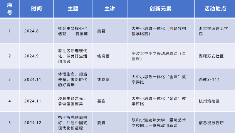 本学期,在教学创新探索方面,主要围绕大中小思政一体化做了一些新的尝试和研究。组织教师观摩两次大中小思政创新实践课,一次是2024年9月26日,“看社区治理现代化,做美好生活创造者”——宁波大中小学移动思政课在甬派平台上全程直播。一次是2024年12月5日,我院在学院新信息楼报告厅联合宁波市老年大学、爱菊艺术学校开展以“携手擦亮使命明灯,共赴中国式现代化新征程”为主题的思政实践教育创新课。课后分别做了专项的交流和研讨,让大部分教师对此类创新课该如何着手准备,怎样进行教学设计,以及如何达到教学目标等核心问题有了一定的了解,为日后更多青年教师开展教学创新提供了良好的学习机会。