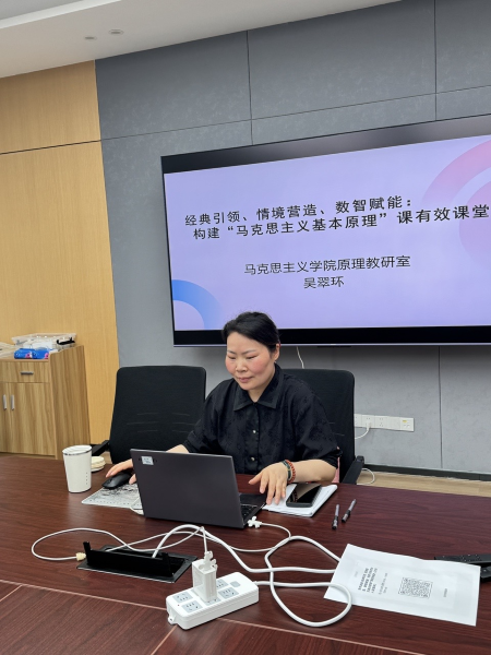 2025年4月10日下午,在海曙校区西教2-414会议室,马克思主义学院原理教研室负责人吴翠环老师开展了题为“经典引领、情境营造、数智赋能:构建《马克思主义基本原理》课有效课堂”的讲座。