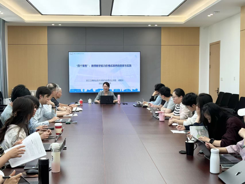 靖国华院长从聚焦常规教学、聚焦教学改革、聚焦团队合作、聚焦赛训平台四个方面讲述了围绕青年教师教学能力培养“怎么做”的问题。首先,聚焦常规教学。她将学生成长作为第一目标,教师发展作为第二目标。一是做到课堂教学创新有效,努力实现从教学能力提升到教学获奖的转换。二是持续推动教学改革,通过教学建设提升教师研究能力,促进教改项目成功立项。三是狠抓教学效果,通过模式创新带动质量提升,进一步争取教学成果获奖。为夯实教师教学基本功,通过集体备课磨课、开设公开课示范课、“双导师”传帮带,助力青年教师专业素养提升和基本教学规范养成。其次,聚焦教学改革。立足于做实教学实践锻炼场的定位积极作为。以课程改革为依托,教材转化为契机,方法创新为路径,她们探索践行“三联四融”思政课教学模式,做到立足信仰主课堂,讲好理论;丰富实践活课堂,用好理论;打通智慧新课堂,深化理论。在教学方法创新上,她们坚持“八个相统一”,改革教学方式,创新学生自主参与、积极体验的理实一体教学方法,不断增强思政课的“三性一力”。为进一步拓展教学场域,她们积极推进大思政课实践教学基地建设,实现了专业教师、基地导师、德育导师、朋辈榜样等教学主体的联动。再次,聚焦团队合作。通过建团队、搭平台、强合作、重精神以提升教师队伍的凝聚力。最后,聚焦赛训平台。通过举办马院青年教师教学比赛、参加学校教学能力比赛、宁波市高校课堂创新大赛、参加省教学能力比赛、指导学生参加各类比赛、教学与科研互促等,浙江工商职业技术学院马院教师在密集的锤炼过程中塑造了自身核心竞争力。
