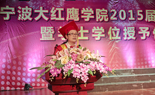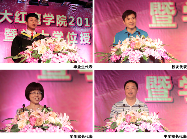 典礼上,11电自4班吴光宇代表全体毕业生感恩学校的精心培育和教师的谆谆教诲,真切表达了对母校的眷恋与不舍,抒发了对美好未来的憧憬与向往。家长代表11机自4班潘孝杰同学家长潘建国先生说,“看着孩子稚嫩的脸庞渐渐成熟,听着孩子对自己未来的憧憬和规划,我很欣慰孩子长大了。这离不开学校、老师对孩子的培养与教诲。”在这开启新的人生旅程之际,他希望全体毕业生永远记住母校与老师在思想上的指引、学业上的叮嘱、生活上的照顾。教师代表王美英老师回忆了四年里与同学们一起学习、生活的精彩点滴,并勉励毕业生“大胆、勇敢地去闯、去奋斗,母校永远是你们的精神家园和坚强后盾”。校友代表04级机电专业毕业生、银盛电子宁波分公司金融渠道部总经理徐群六寄语毕业生“选择、进取、宽厚、快乐”,希望大家在追梦的道路上学会选择、积极进取、宽厚待人、快乐工作。