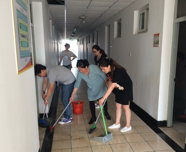 为尽量减少台风造成的损失,确保每一间学生寝室整洁,全体学生事务中心老师逐间排查各学生公寓楼。本部校区共有20幢学生公寓楼、2000多间学生寝室,任务重、时间紧,因为,一间寝室的渗水的问题可能会导致多间寝室发生连锁影响。合理的分配,默契的配合,她们以最快的速度完成了排查工作,并立即对90多间渗水寝室展开了清扫工作,力争将同学们的损失降到最低。