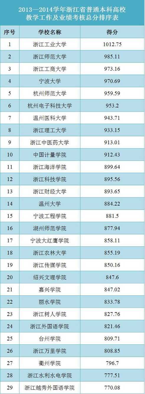 日前,浙江省教育厅、浙江省财政厅办公室公布了2013-2014学年普通本科高校教学工作及业绩考核结果,我校以总分858.11分名列全省29所本科院校(不含浙江大学)的第17位,较上学年度有显著提高。