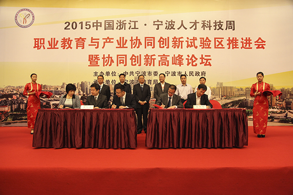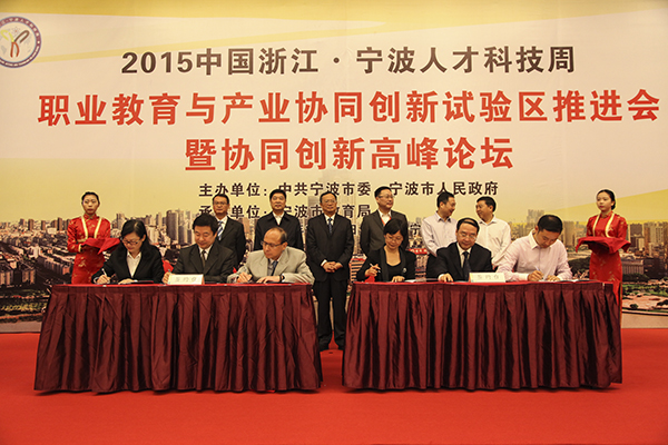 10月12日上午,宁波市职业教育与产业协同创新试验区推进会暨协同创新高峰论坛举行。会上,市政府相关部门与县(市)区政府、在甬高校、国内外名企、省属有关部门共同搭建了一批合作的平台和载体,共签署了10项职业教育与产业协同创新合作项目,其中我校签订了2项合作项目。