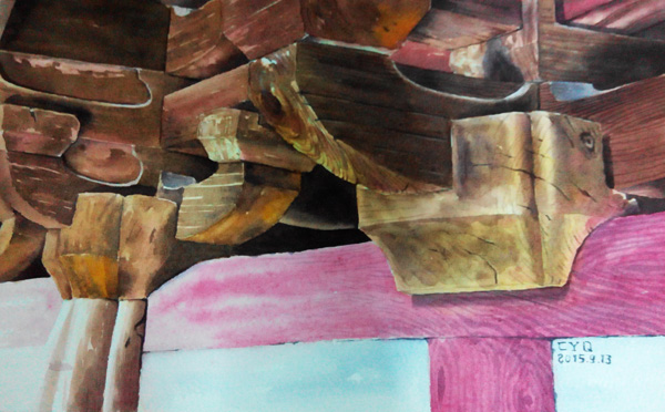 褚育青老师是我校图书馆馆员,画画是他的业余爱好。保国寺的千年大殿在他看来更是一座神奇的古建筑,斗拱又是最具特色的古建筑结构,所以他选择这个题材进行创作,希望通过手绘作品再现斗拱的细节之美和沧桑之味,表现出保国寺深厚的历史感和文化感。