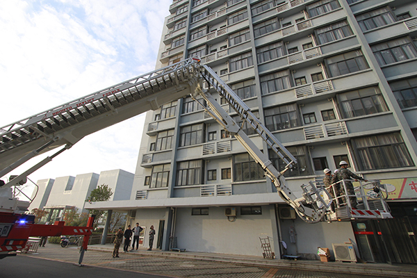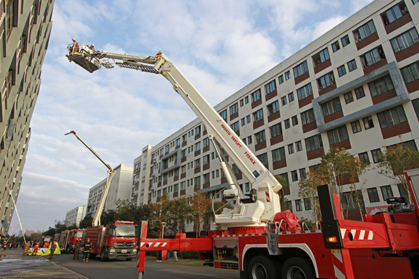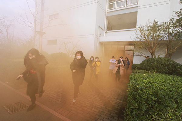 当天下午,演练活动正式开始:杭州湾校区四号学生公寓某寝室“因电路短板”发生“火情”。 “火势”较大,无法扑灭,数名学生被困寝室。公寓值班老师迅速向行政总值班及保卫处值班人员报告“火情”,校区立即启动消防应急预案。参加逃生疏散演练的学生在辅导员、宿管员的引导下用湿毛巾捂住口鼻,弯腰从“火灾”现场按楼层有序撤离。与此同时,杭州湾跨海大桥消防中队在接警后,火速赶到“火灾”现场,通过消防云梯、高压水枪、救生气垫等设备控制“火情”、“营救”被困学生。当最后一名被困学生被成功施救,现场爆发了热烈掌声。