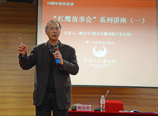 4月14日下午,我校15周年校庆系列活动之“红鹰故事会”首场讲座在小剧场热烈举行。我校退休教师、原工会主席顾方平应邀为全校师生做题为“发扬艰苦奋斗光荣传统,共创阳光事业美好未来”的讲座,300多名师生到场聆听了讲座。