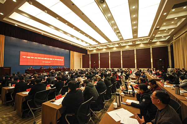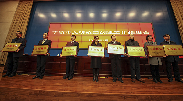 2月1日下午,宁波市文明校园创建工作推进会在市行政会议中心306会议室举行。会议表彰了首批“宁波市文明校园”获奖单位,我校以高校组第一名的优异成绩荣膺首批“宁波市文明校园”称号。校长孙惠敏出席会议并登台接受奖牌,同时作为高校获奖代表在会上作经验交流。