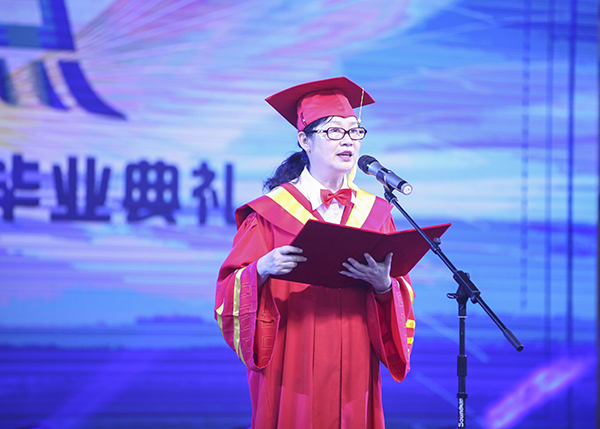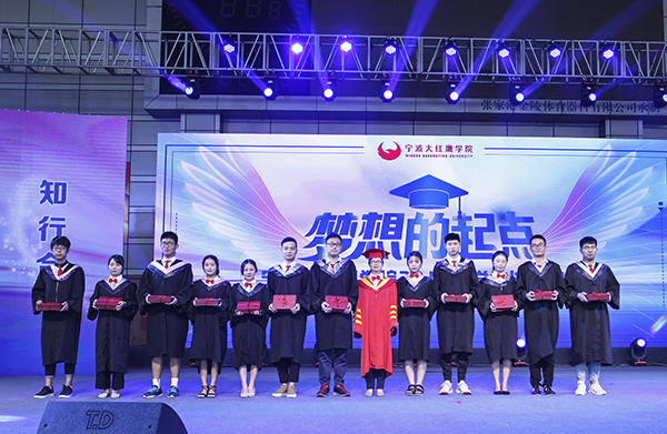 孙惠敏校长作了题为《传承大红鹰精神 奋斗成就梦想》的讲话。她代表学校向圆满完成学业的毕业生表示热烈祝贺并送上美好的祝福。随后,她为同学们讲述了大红鹰人的创业故事。她动情地说,“宁波卷烟厂厂长徐芳权等企业家心怀‘让更多的人能读书读好书’的教育梦想,‘不求经济回报,只求回报社会’的社会担当,与市教委签订协议,决心创办一所非营利的民办大学。2000年,在农田密布的高桥芦港,学校打下了第一根基桩。2001年,一座崭新建成的大学屹立于三江之滨。企业家们‘回报社会、培育英才’的兴资办学之梦正式起航。由此,万千学子多了一个圆梦大学的选择。”她强调,学校建设者感佩于企业家们情系教育的无私胸怀,全身心投入到学校的创业发展;坚持“以学生为本”的教育理念,凝聚全校师生力量,克服了一个个改革道路上面临的难题,抓住了一次次挑战中孕育的机遇,用十二分的努力践行着办“好大学”的梦想。
