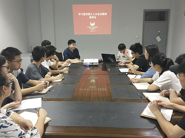 学校团委组织学生干部开展了习近平总书记在北京大学师生座谈会上的讲话精神和团十八大精神学习活动,同学们表示,共青团是党的助手和后备军,我们要以“爱国、励志、求真、力行”的要求,积极参加暑期社会实践服务活动,用青春激情跟党走,勇向前。