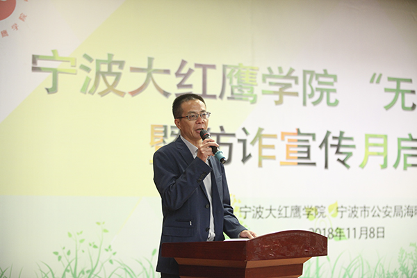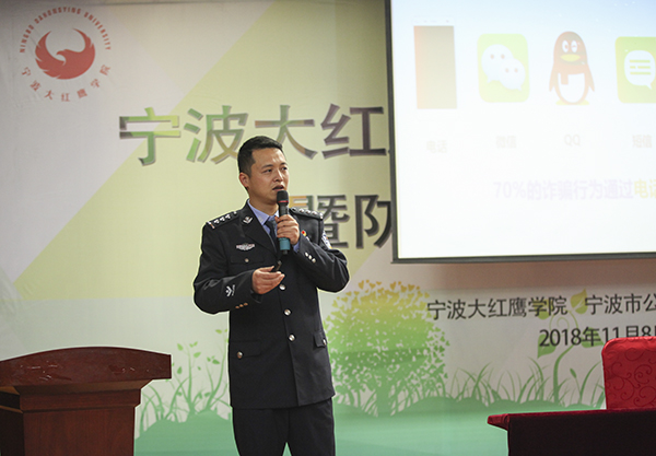 活动上,市公安局海曙分局刑事侦查大队郑建波警官还为师生们上了一堂防诈骗安全课,他结合各高校发生的通讯网络诈骗真实案例,深入浅出地分析了各类网络诈骗手段的特点,为大家普及了防范知识。