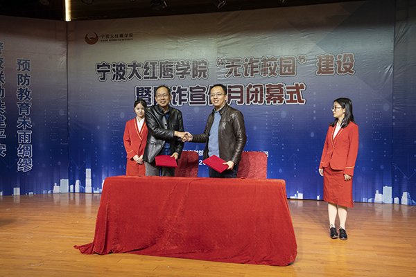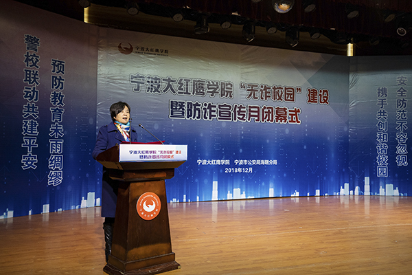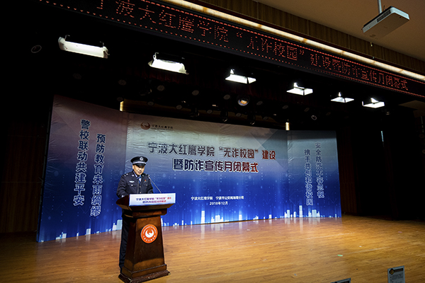 12月27日中午,我校“无诈校园”暨防诈宣传月闭幕式在中区小剧场举行。市公安局海曙分局党委委员、副局长任建明,海曙区高桥镇党委副书记叶夏凯,高桥镇党委委员、高桥派出所所长崔磊,校长助理何秋叶等出席。党委宣传部、保卫处、学生处、校团委有关负责人,学生军训教导队全体成员,各二级学院师生代表等参加活动。