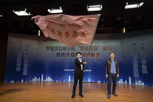 市公安局海曙分局党委委员、副局长任建明(右一)为我校授予“反诈骗志愿者服务分队”队旗