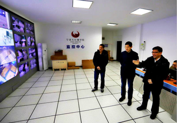 市教育局副局长、党委副书记张力鸣(中)查看我校校园监控设备