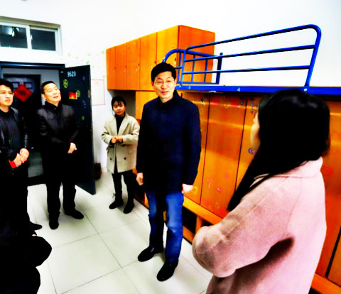 在学校校园监控中心,张力鸣仔细查看了相关工作记录情况,听取了我校寒假安全工作情况介绍,并再三叮嘱保卫工作人员认真做好安全保障、确保校园安全。随后,张力鸣又来到学生寒假集中住宿的北9公寓楼,重点走访了留校学生寝室和学工值班室,亲切询问了师生们寒假生活、工作和学习安排情况。他希望同学们协调好学习、工作和生活,注意劳逸结合,为求职就业、考研深造和新学期学习做好充分准备。同时,他向值班教师和留校同学送上了温馨祝福,祝愿老师同学们新春快乐,工作顺利,学习进步!